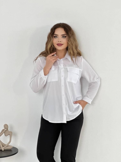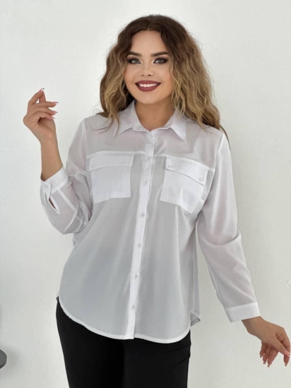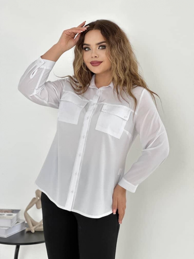 Манжеты рукавов аккуратно застегиваются на пуговицу, что придаёт блузке дополнительный интересный акцент. На полочках расположены накладные карманы с клапанами, которые не только функциональны, но и добавляют стильный штрих к общему дизайну. Спереди блузка украшена супатной застежкой на петли и пуговицы, которые создают элегантный, офисный стиль.
