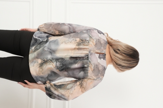 Крой блузки продуман до мелочей: он акцентирует внимание на достоинствах фигуры, мягко скрывая недостатки в области талии и бедер. Это делает модель универсальной и подходящей для различных типов фигур.