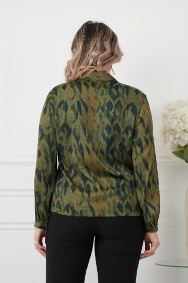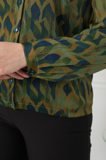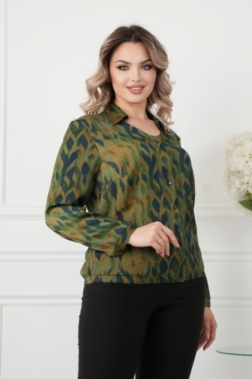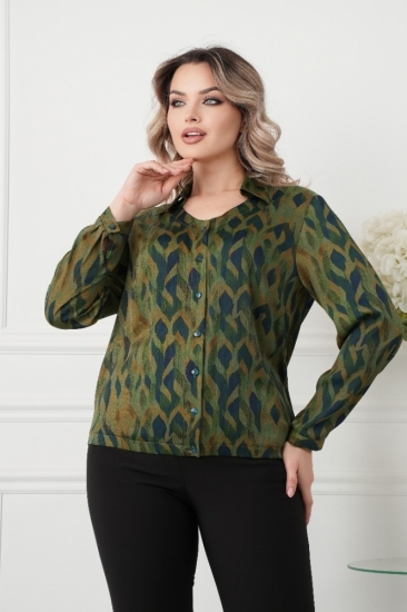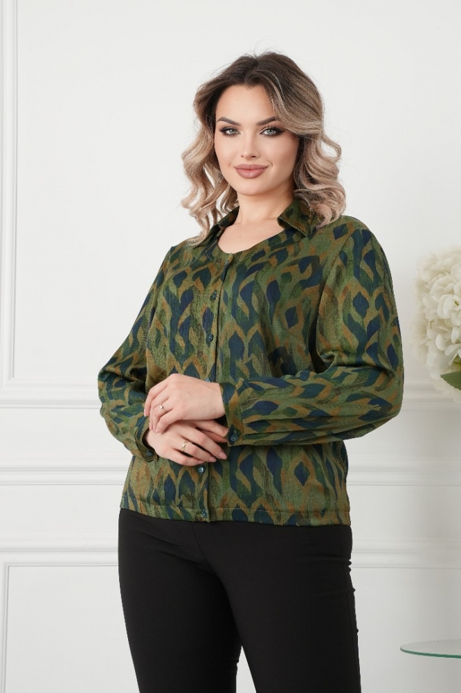 Рубашечный крой придаёт блузке дополнительный изысканный вид. Спереди блузка украшена супатной застежкой на петли и пуговицы, которые создают офисный стиль, а расцветка визуально скрывает все недостатки.