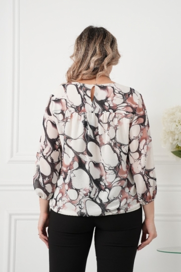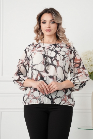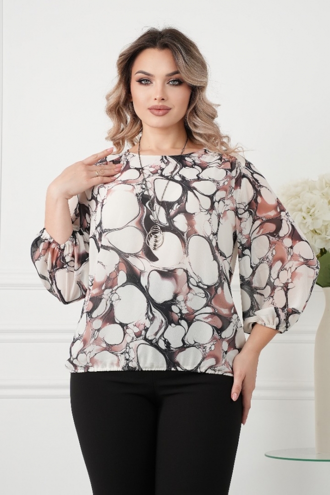Крой блузки продуман до мелочей: он акцентирует внимание на достоинствах фигуры, мягко скрывая недостатки в области талии и бедер. Это делает модель универсальной и подходящей для различных типов фигур.