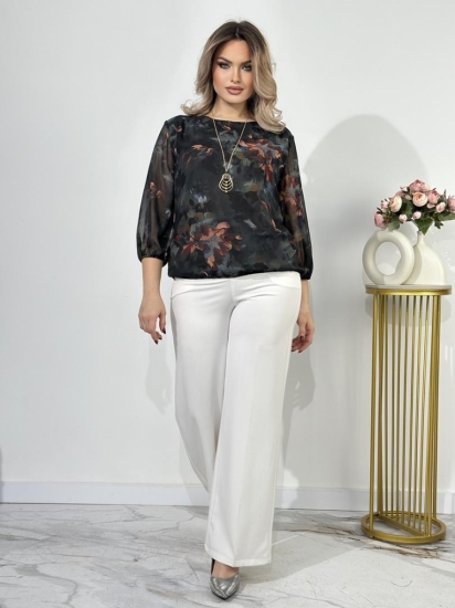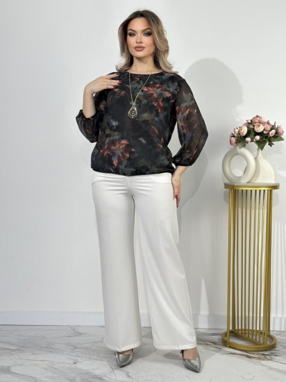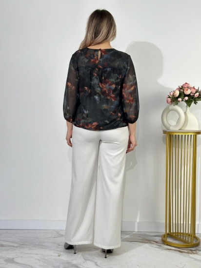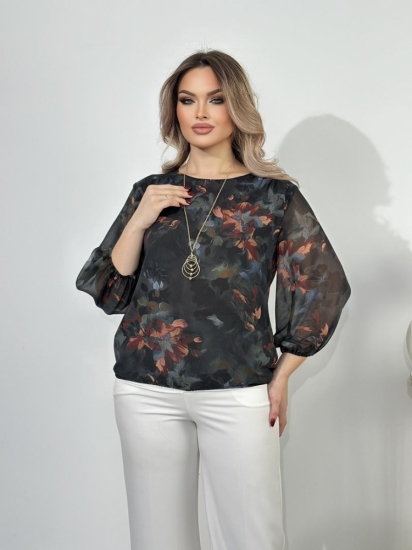 Крой блузки продуман до мелочей: он акцентирует внимание на достоинствах фигуры, мягко скрывая недостатки в области талии и бедер. Это делает модель универсальной и подходящей для различных типов фигур.