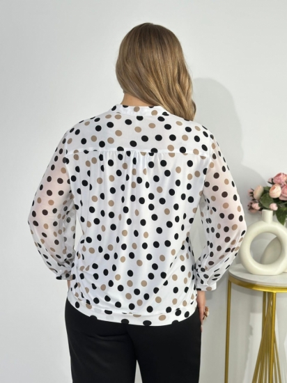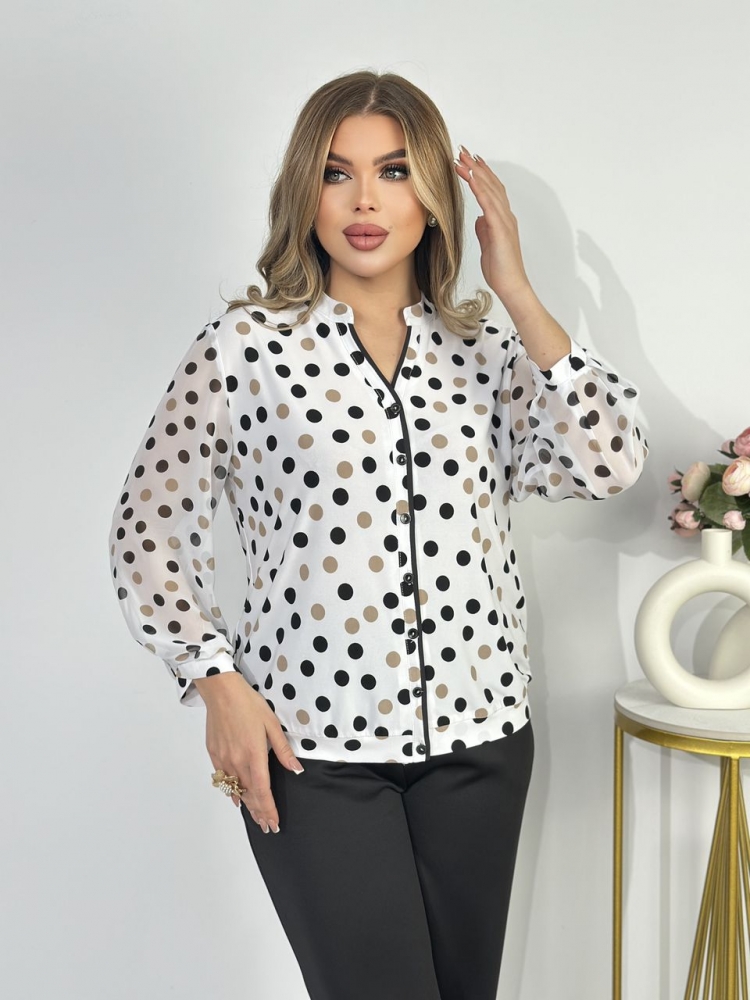 Ориентированный на российские стандарты, крой блузки прекрасно подчеркивает достоинства фигуры и скрывает ее недостатки, что делает ее идеальным выбором для женщин с различными типами телосложения.