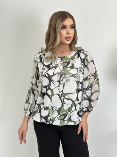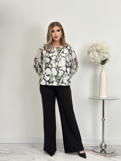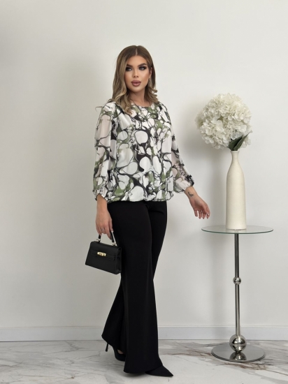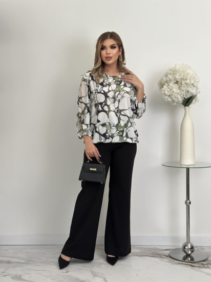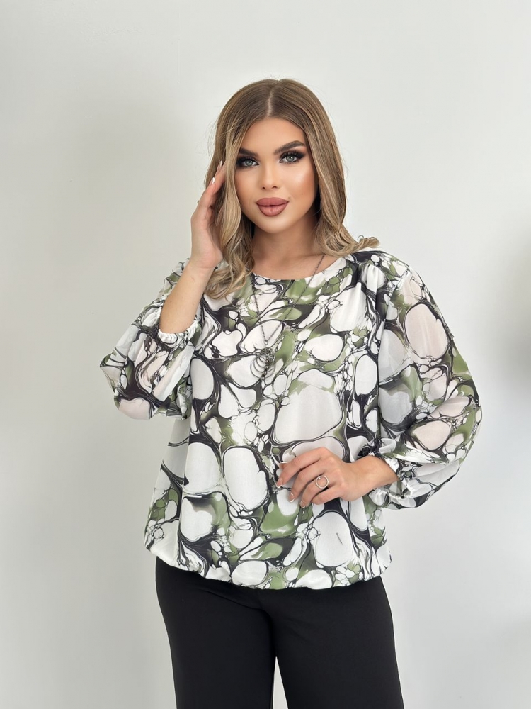 Крой блузки продуман до мелочей: он акцентирует внимание на достоинствах фигуры, мягко скрывая недостатки в области талии и бедер. Это делает модель универсальной и подходящей для различных типов фигур.