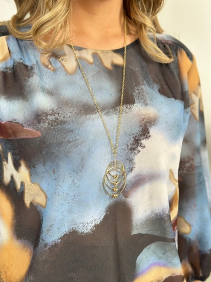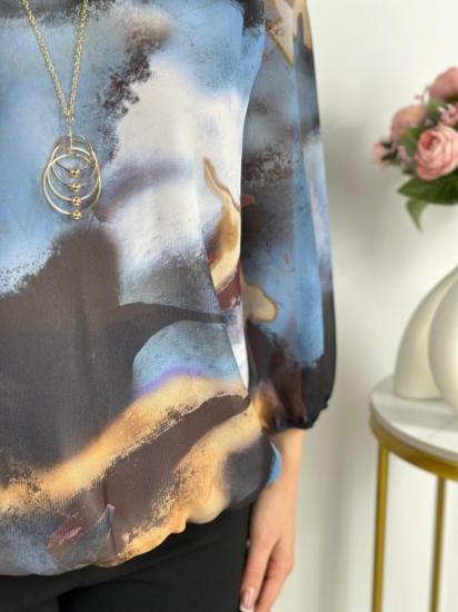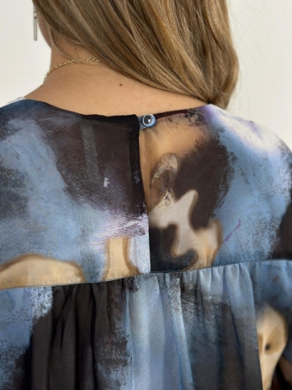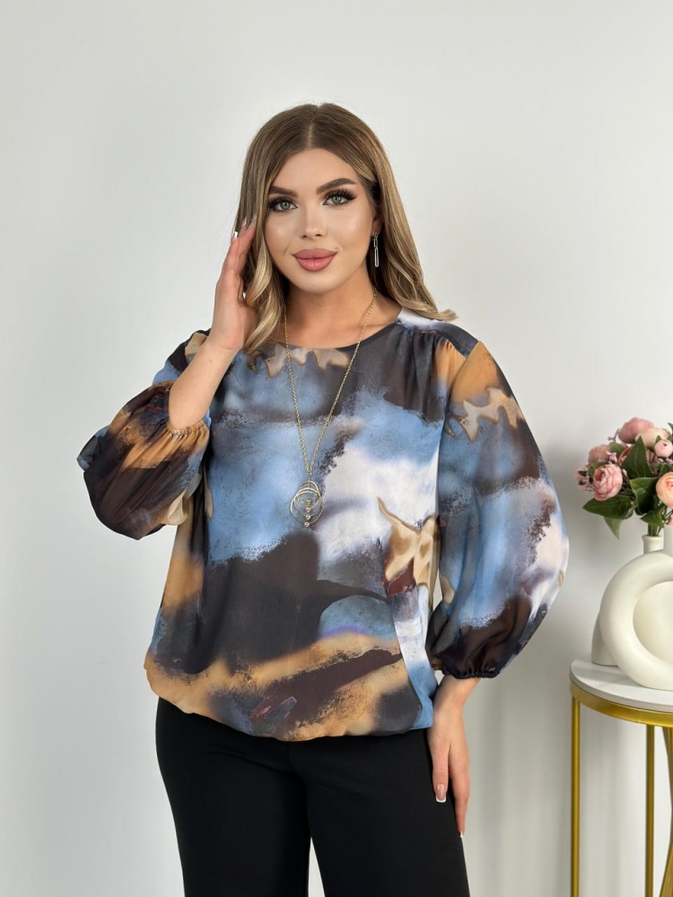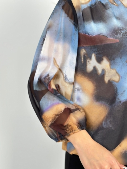 Крой блузки продуман до мелочей: он акцентирует внимание на достоинствах фигуры, мягко скрывая недостатки в области талии и бедер. Это делает модель универсальной и подходящей для различных типов фигур.