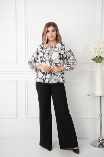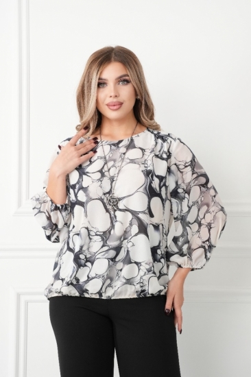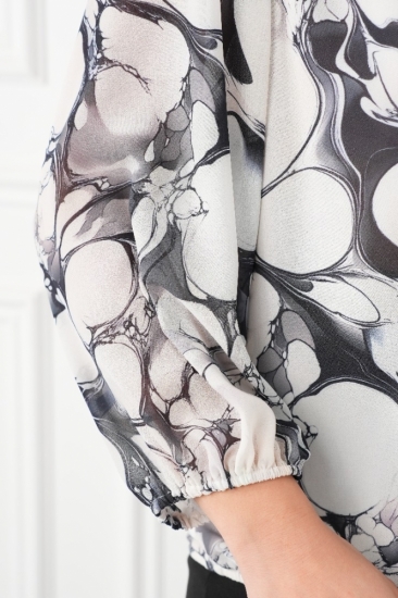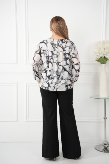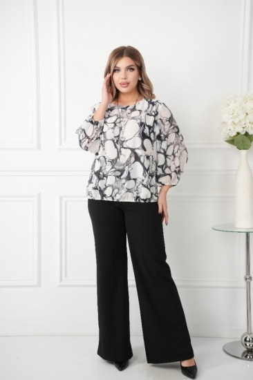 Крой блузки продуман до мелочей: он акцентирует внимание на достоинствах фигуры, мягко скрывая недостатки в области талии и бедер. Это делает модель универсальной и подходящей для различных типов фигур.