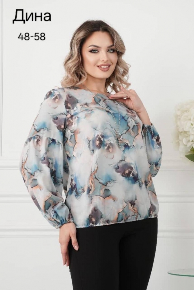 Блуза имеет округлую горловину, что придает ей мягкость и элегантность, а объемные рукава добавляют нотку романтики и стильного акцента. Крой разработан с умом: он акцентирует достоинства, а также деликатно скрывает недостатки в области талии и бедер, что делает блузу универсальным вариантом для различных типов фигур.