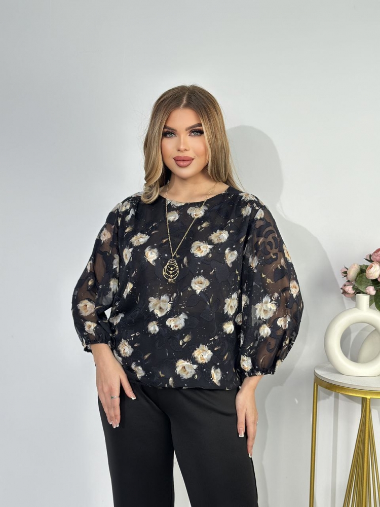 Крой блузки продуман до мелочей: он акцентирует внимание на достоинствах фигуры, мягко скрывая недостатки в области талии и бедер. Это делает модель универсальной и подходящей для различных типов фигур.