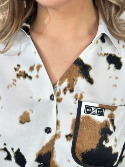 - Блузка-бомбер рубашечного покроя с V-образным вырезом, в размерах 46-56, застежка - на петли и пуговицы.